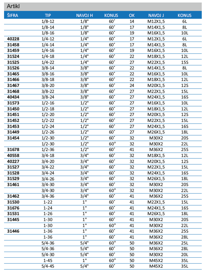 | 31446 | 1-36 - NAVOJ H 1" / KONUS 60˚ - OK 41 - NAVOJ J M36X2 / KONUS 25S | |