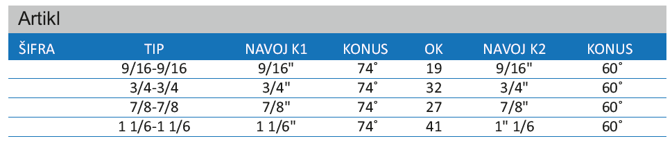 | R001-31 | 9/16-9/16 - NAVOJ K 9/16" / KONUS 74° - OK 19 - NAVOJ K 9/16" / KONUS 60° | |